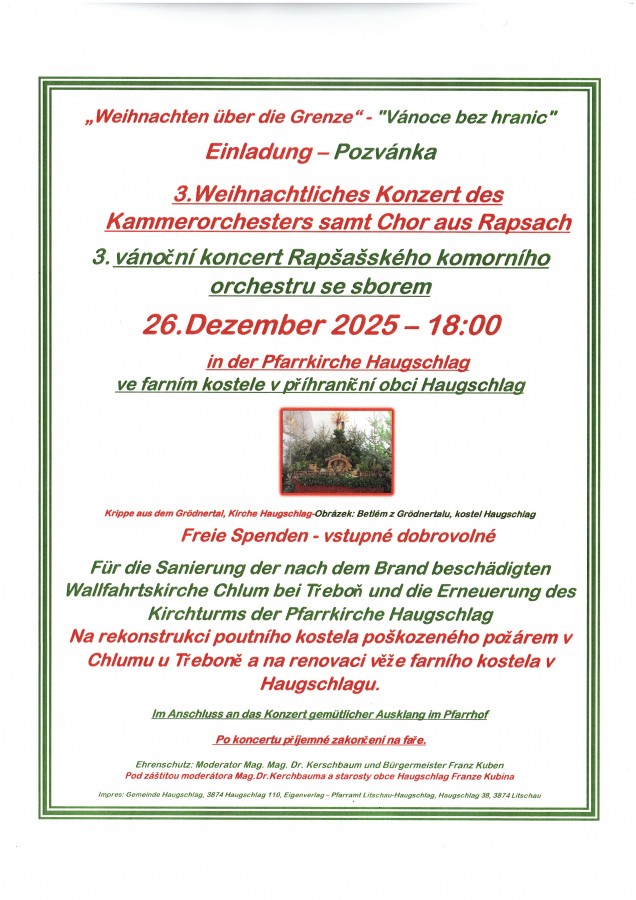 "Vánoce přes hranice - Weihnachten über die Grenze", Vánoční koncert Rapšašského komorního orchestru, farní kostel v Haugschlagu (cca 12 km od Chlumu) 26. prosince