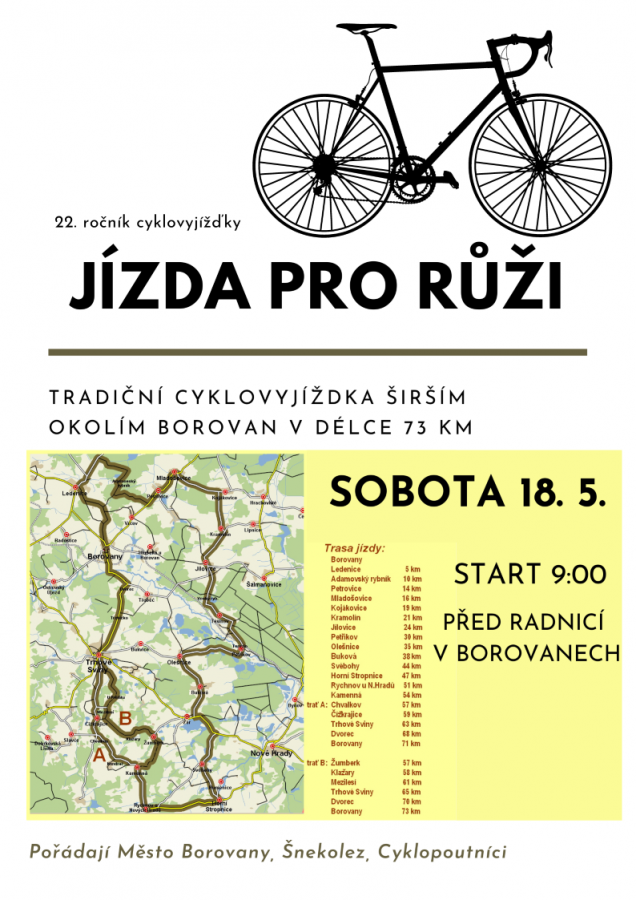 Tradiční borovanskou cyklistickou vyjížďkou mikroregionem Sdružení Růže je Jízda pro růži, která bude v sobotu 16. května 2026. Tato akce je pro nejširší veřejnost.