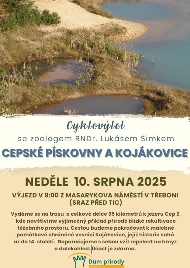 Dům přírody Třeboňska zve v neděli 10. srpna 2025 na cykloexkurzi pod vedením zoologa RNDr. Lukáše Šimka. Cílem exkurze jsou Cepské pískovny a Kojákovice.