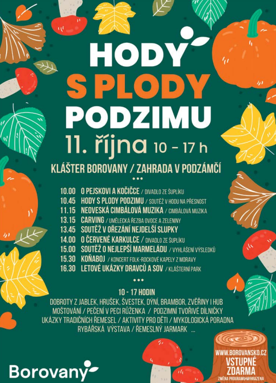 Říjen v Borovanech tradičně patří oblíbené slavnosti Hody s plody podzimu. Letos se potkáme v sobotu 11. října od 10 do 17 hodin v zahradě borovanského kláštera. A protože loni nám počasí připomínalo spíš zimu než podzim, věříme, že tentokrát si společně užijeme i trochu slunce. Bohatý program, který jsme pro vás připravili, si to rozhodně zaslouží. Pro děti jsou připravené dvě pohádky v podání Divadla ze šuplíku a atmosféru Moravy do Borovan přiveze Neoveská cimbálová muzika se svým programem Morava na cestách. Příznivci folkrocku se mohou těšit na koncert kapely Koňaboj a milovníky zvířat nadchne poutavá ukázka sokolníka Miloslava Vondrušky, který předvede své dravce a sovy při letových ukázkách. Program okoření i několik soutěží. Své dovednosti můžete ukázat v soutěži Hody s plody podzimu v hodu na přesnost, pokusit se vyřezat co nejdelší jablečnou slupku nebo představit své kulinářské umění v Soutěži o nejlepší marmeládu. Vzorky marmelád můžete nosit už teď do borovanského infocentra. Vyhlásíme i vítěze fotografické soutěže O perlu Borovan. Celý den bude provázet bohatý doprovodný program. Návštěvníci si prohlédnou ukázky ozdobné řezby do zeleniny a ovoce, poradí se v mykologické poradně s výstavou hub a chybět nebude rybářská výstava s živými rybami. Pro děti jsou připravené podzimní bojovky a šifrované stezky, hravé aktivity se zapojením smyslů, zábavné atrakce i tematické řemeslné dílny. Dospělí si mezitím pochutnají na čerstvě lisovaném jablečném moštu, na křupavém pečivu z místní pece Růženka a dalších slaných i sladkých podzimních dobrotách.