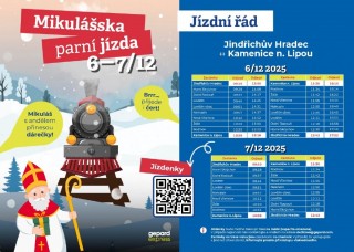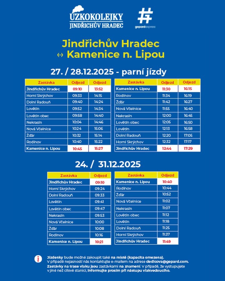 Motorové vlaky vyjedou 24. a 31. prosince 2025. Z Jindřichova Hradce odjedou v 9:10 a do Kamenice nad Lipou přijedou v 10:21. Zpáteční spoj z Kamenice nad Lipou vyrazí v 10:40 a do Jindřichova Hradce dorazí v 11:49.