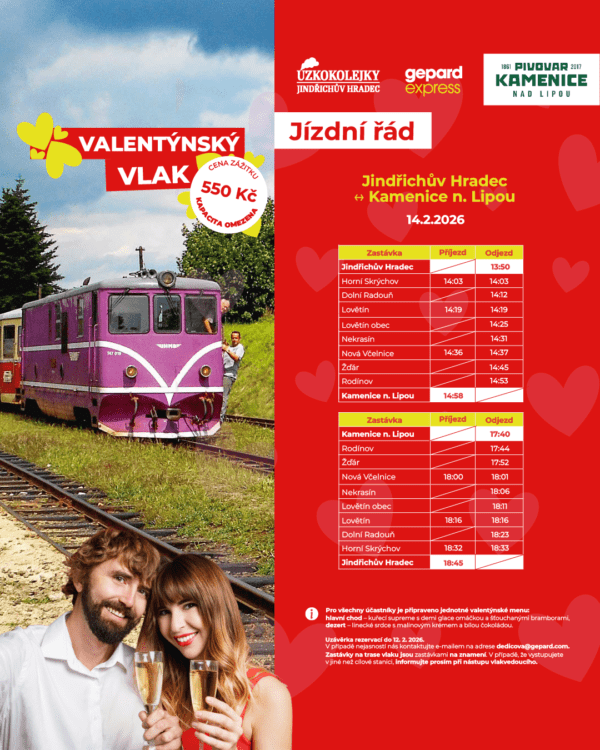 Vydejte se v sobotu 14. února 2026 speciálním valentýnským vlakem z Jindřichova Hradce do Kamenice nad Lipou, kde na vás bude v místním pivovaru čekat romantická večeře.
