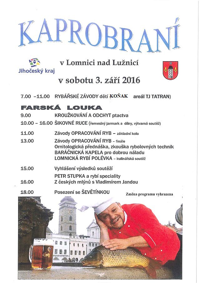 V sobotu 3. září 2016 bude v Lomnici nad Lužnicí tradiční rybářská slavnost. Rybářské závody dětí budou na rybníce Koňak, program se bude odehrávat na Farské louce. Jste srdečně zváni.