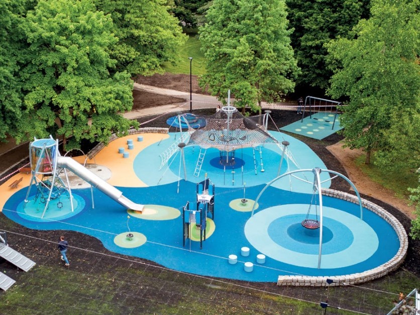 Bezpečnost hřiště je zaručena dopadovými plochami EPDM, které umožňují i barevné ztvárnění hřiště.