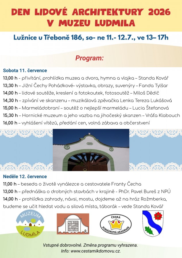Pozvánka do obce Lužnice do Muzea jihočeské lidové architektury na akce a události, připravované v Muzeu Ludmila v průběhu roku. Mnohé akce jsou již tradiční; konají se každoročně.