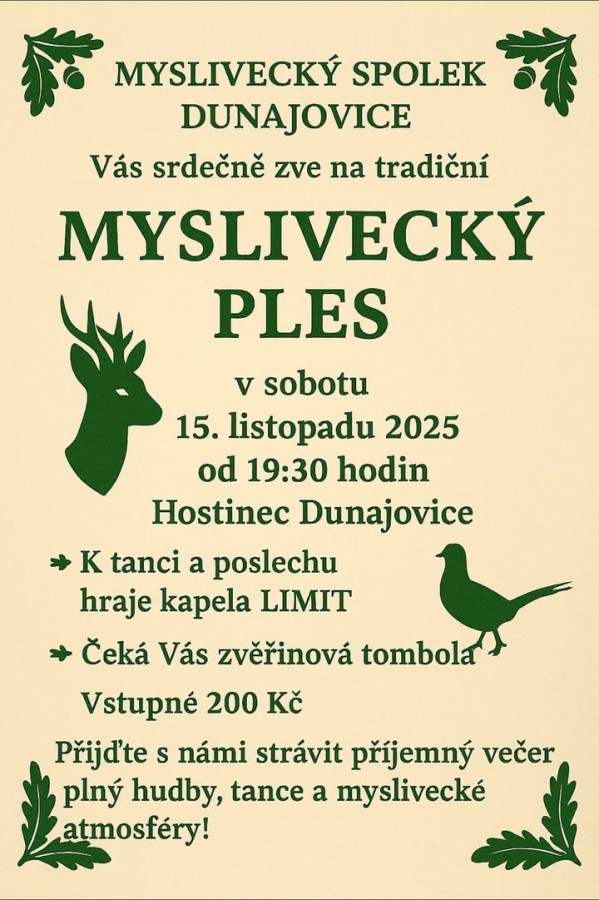 Ples se koná v sobotu 15. listopadu 2025 od 19.30 v Hostinci Dunajovice.