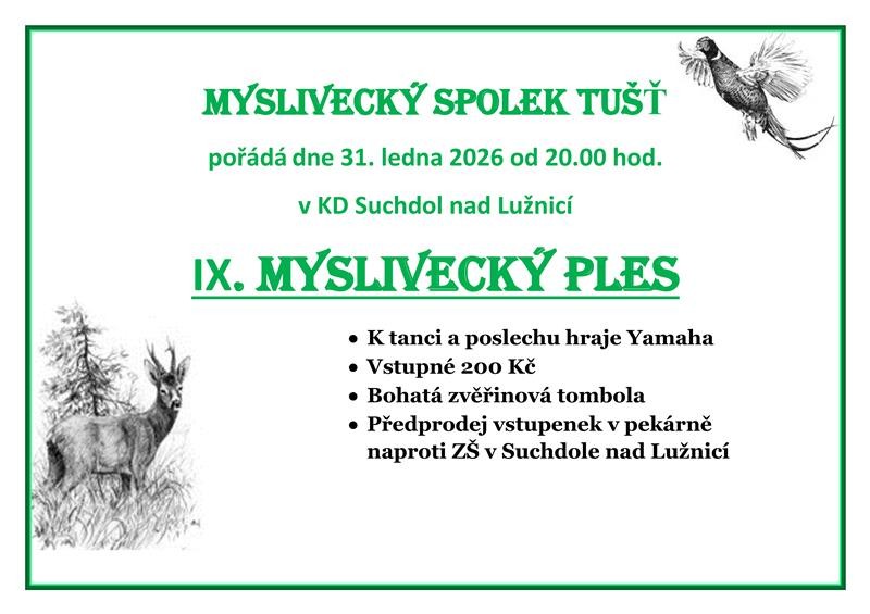 Pozvánka 31. ledna 2026 do Suchdola nad Lužnicí na tradiční ples, který pořádá Myslivecký spolek Tušť od 20.00 hodin v kulturním domě Suchdol nad Lužnicí.
