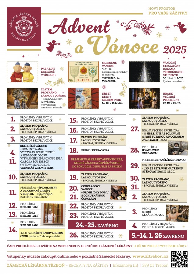 Pozvánka 20. a 21. prosince 2025 do Třeboně na zajímavou adventní prohlídku Zámecké lékárny, která jistě zaujme nejen milovníky čokolády.