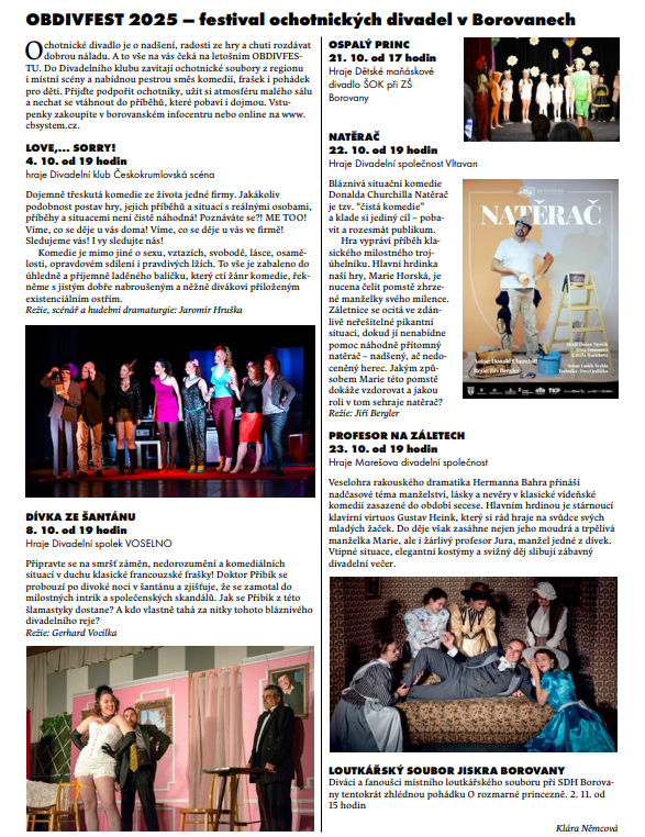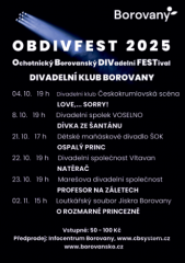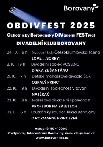 Pozvánka do Borovan v říjnu 2025 na festival ochotnických divadel OBDIVFEST aneb Ochotnický Borovanský DIVadelní FESTival.