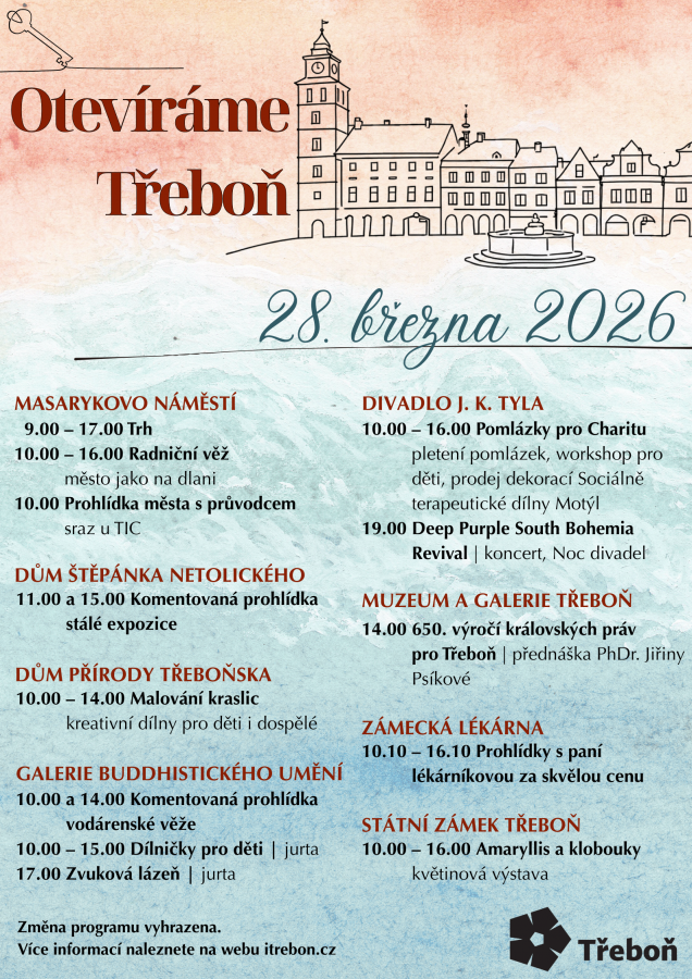 V sobotu 28. března se Třeboň znovu naplno probudí k životu po zimním spánku. Zveme všechny místní obyvatele i návštěvníky na unikátní akci s názvem Otevíráme Třeboň, která spojuje tradice spolu s novými zážitky, a vytváří tak pro všechny jedinečnou příležitost, jak oslavit příchod jara a prozkoumat krásy našeho města.