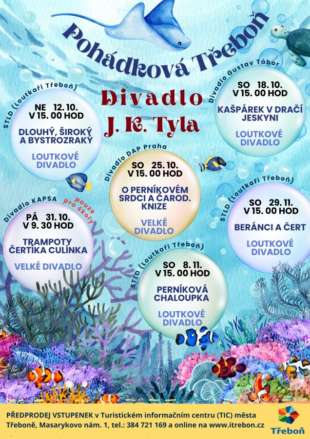 V říjnu a listopadu 2025 čeká pro děti a jejích doprovod řada představení; místem konání je třeboňské Divadlo J. K. Tyla a popř. Loutkové divadlo.
