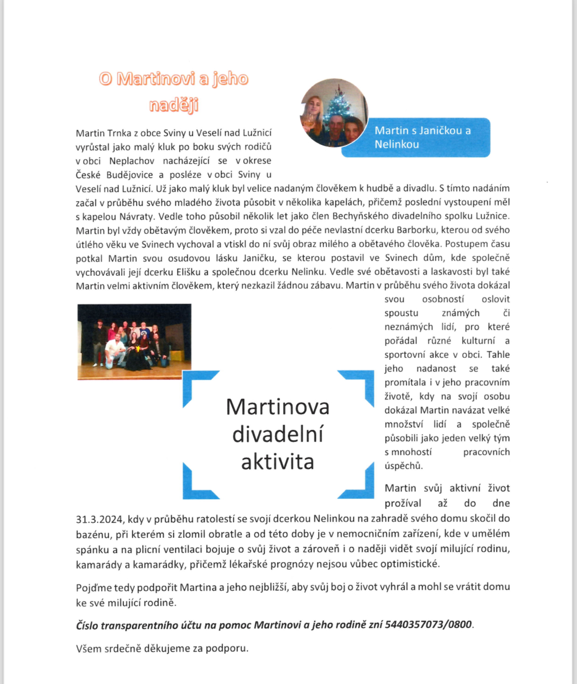 moc prosím o jakoukoli formu zveřejnění příběhu a čísla transparentním účtu stran pomoci Martinu Trnkovi z obce Sviny na Veselsku.