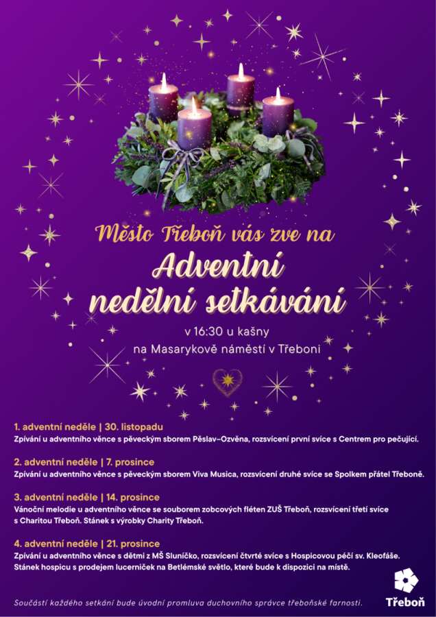 Třetí adventní neděli 14. prosince 2025 zahraje souboru zobcových fléten ZUŠ Třeboň a rozsvícení adventní svíce bude pod patronací ředitelky Oblastní charity Třeboň. V charitním stánku si budete moci koupit výrobky chráněné dílny, které mohou být milými vánočními dárky.