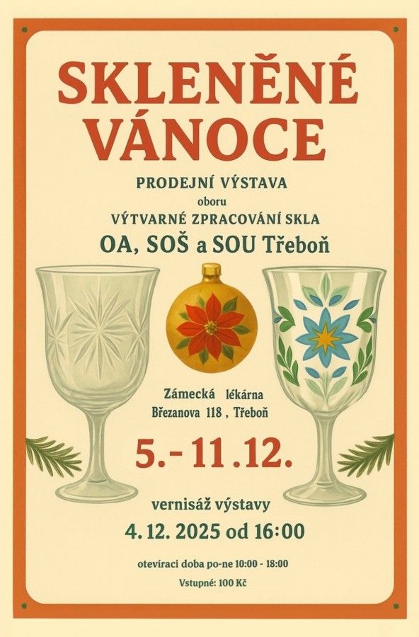 Zveme vás opět po roce na výstavu výrobků ze skla studentů školy OA, SOŠ a SOU Třeboň, která k adventnímu času v Třeboni již neodmyslitelně patří. Nenechte si ji ujít!