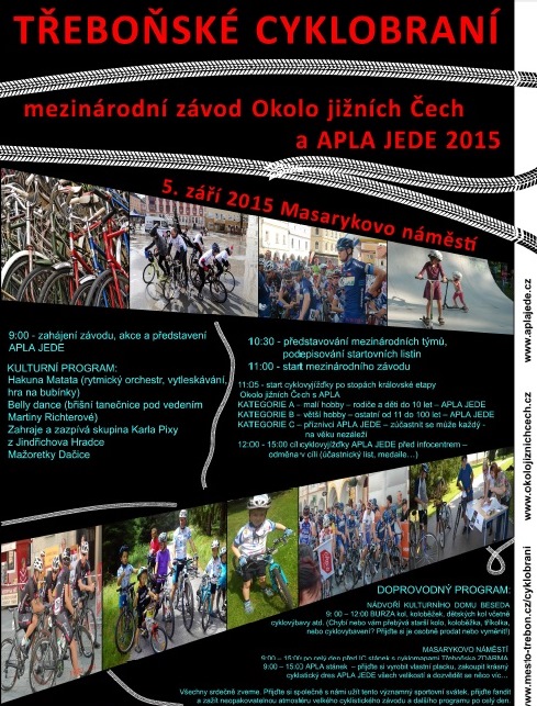 Na své si přijdou malí i velcí příznivci cyklistiky, kteří následně odstartují ve třech kategoriích cyklovyjížďku s APLA JEDE. Posláním tohoto projektu je pomáhat lidem s autismem. V cíli před infocentrem na náměstí čeká na všechny účastnický list, medaile a drobné dárky na stánku, kde po celý den budou k dispozici cyklistické mapy regionu Třeboňska ZDARMA. Na stánku APLA JEDE si můžete přijít vyrobit placku či zakoupit pěkný cyklodres.