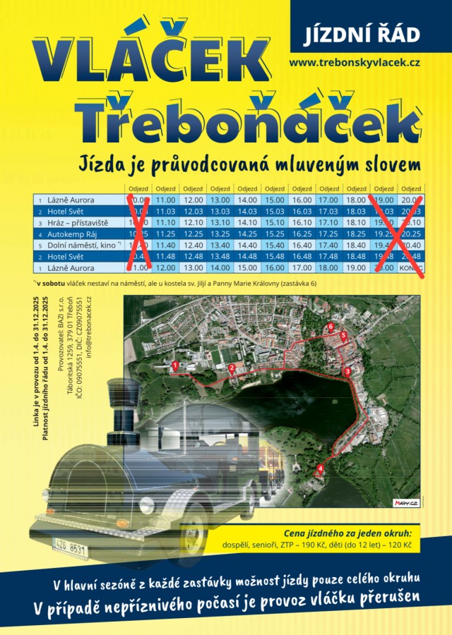 Vláček bude jezdit v Třeboni od začátku května 2025. Jakmile budeme mít od provozovatele konkrétní informace, zveřejníme je zde.