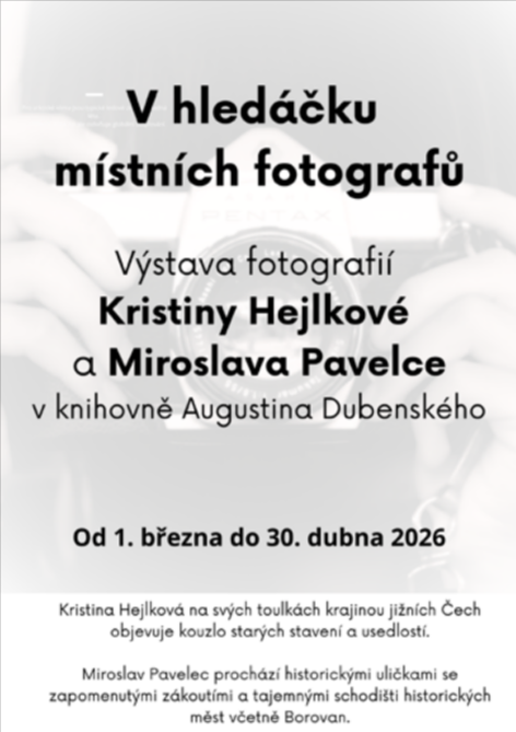 Výstava fotografií Kristiny Hejlkové a Miroslava Pavelce, místních fotografů toulajících se krajinou jižních Čech i historickými uličkami měst.
