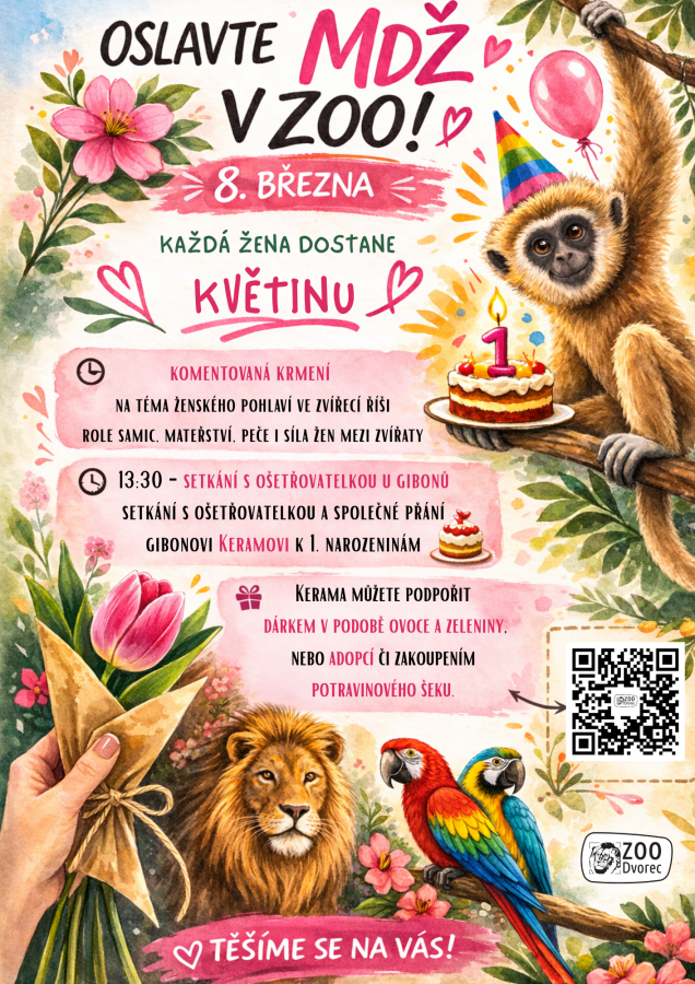 - 8. 3. oslaví první narozeniny samec gibona lara, jménem Keram. 8. března tak oslaví své první narozeniny. První rok života si připomeneme ve 13:30 setkáním s ošetřovatelkou u expozice gibonů.